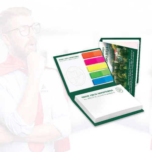 Едни от еко сувенирите, които са най-ефективни, но рядко поръчвани. Всяка една част от продуктът е направен от екологично чист материал.Това подпомага служителите, които използват лепящите листове да се замислят за това колко често използват хартия, да я пестят и да ценят опазването на околната среда, но същевременно чрез брандираното лого- да се разпострани и наложи популярността на компанията. Лепящите листчета са едни от най-разпостранените офис принадлежности, които биват пренебрегвани. Макар не от скоро, този рекламен продукт може да се превърне в иновативен начин за популяризация на еко движението сред потребителите.