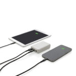Външна батерия с джобен размер 10 000 mAh, където кутията е направена от сертифицирана по RCS рециклирана ABS пластмаса. RCS (Recycled Claim Standard) е стандарт за проверка на рециклираното съдържание на продукт по цялата верига на доставки. Общо рециклирано съдържание: 15% на базата на общото тегло на артикула. Когато е напълно заредена, powerbank ви осигурява достатъчно енергия, за да презаредите мобилния си телефон до пет пъти. Powerbank съдържа дълготрайна литиево-полимерна батерия с висока плътност клас A 10 000 mAh. Индикаторите за захранване ще показват нивото на оставащата енергия, така че винаги да знаете кога да презаредите. Micro USB вход 5V/2A; Тип-C вход 5V/2A; USB изход 5V/2A; Артикули и аксесоари без PVC. Включително кабел за зареждане от рециклиран TPE материал без PVC.