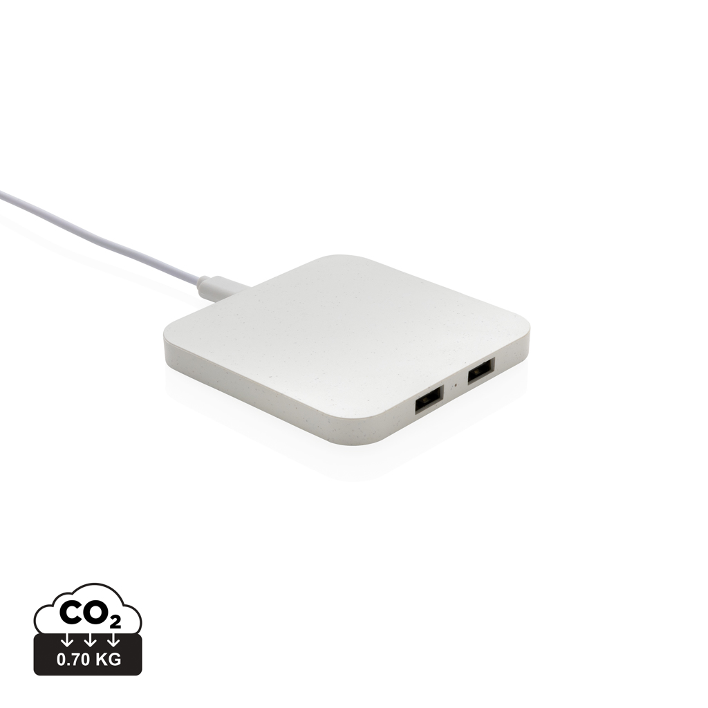 10 W безжично бързо зарядно устройство с два USB порта, направено с RCS (Recycled Claim Standard) сертифициран рециклиран ABS. Общо рециклирано съдържание: 57% на базата на общото тегло на артикула. RCS сертификацията гарантира напълно сертифицирана верига за доставки на рециклирани материали. Безжично зареждане, съвместимо с последните поколения Android, iPhone 8 и по-нови. Артикули и аксесоари без PVC. Включително 120 cm тип C кабел за зареждане, изработен от RCS сертифициран рециклиран TPE. Опаковани в FSC смесена крафт кутия. Тип-C вход; Вход 5V/2A; 9V/1.67A. Безжичен изход 5V/1A;9V/1.1A (10W)
