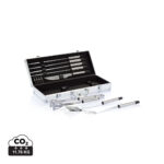 12 бр барбекю комплект от неръждаема стомана, включващ 4 бр шишчета, нож за дърворезба, 4 държача за царевица, шпатула, вилица за дърворезба със защитен капак и чифт щипки. Опакован в алуминиева кутия с панти и дръжка.