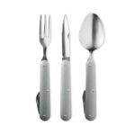 Комплект прибори за къмпинг от неръждаема стомана с алуминиева дръжка. Комбинирана лъжица, вилица и нож се доставят в черна торбичка.