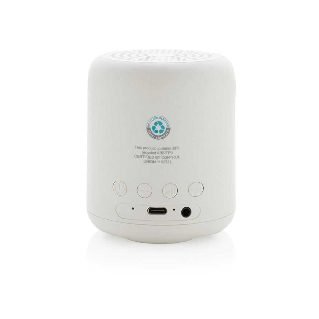 5 W безжична колонка, направен с RCS (Recycled Claim Standard) сертифициран рециклиран ABS и TPE. Общо рециклирано съдържание: 38% на базата на общото тегло на артикула. RCS сертификацията гарантира напълно сертифицирана верига за доставки на рециклирани материали. Колонкаят има вградена светлина в долната част. Колонкаят е оборудван с батерия от 300 mAh, за да осигури до 5 часа време за възпроизвеждане и BT5.0 за плавна връзка и чист звук. Обхват на свързване до 10 метра. С микрофон за отговаряне на повиквания. Опаковани в FSC® смесителна кутия. Включително RCS сертифициран рециклиран TPE кабел за зареждане. Артикул и аксесоари 100% без PVC.