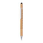 Практична многофункционална химикалка 6 в 1, изработена от бамбук със следните характеристики: въртяща се химикалка с черен системен пълнител, линийка, нивелир, шлицова и кръстата отвертка, както и сензорна химикалка.