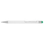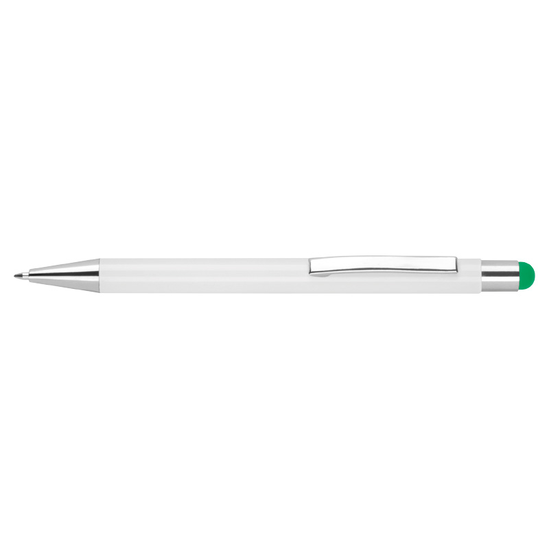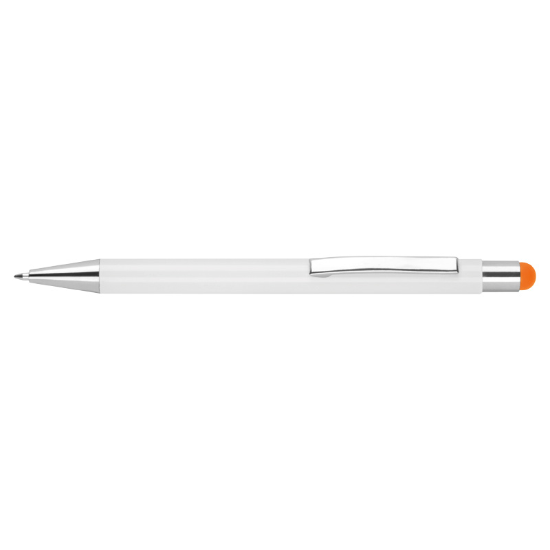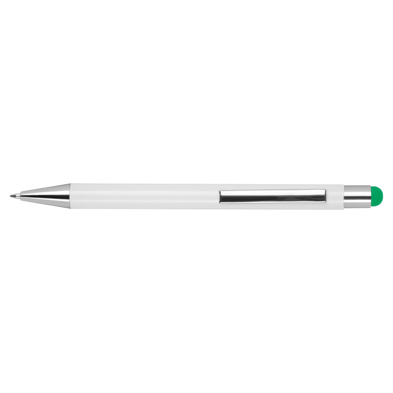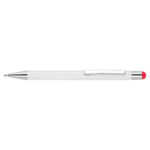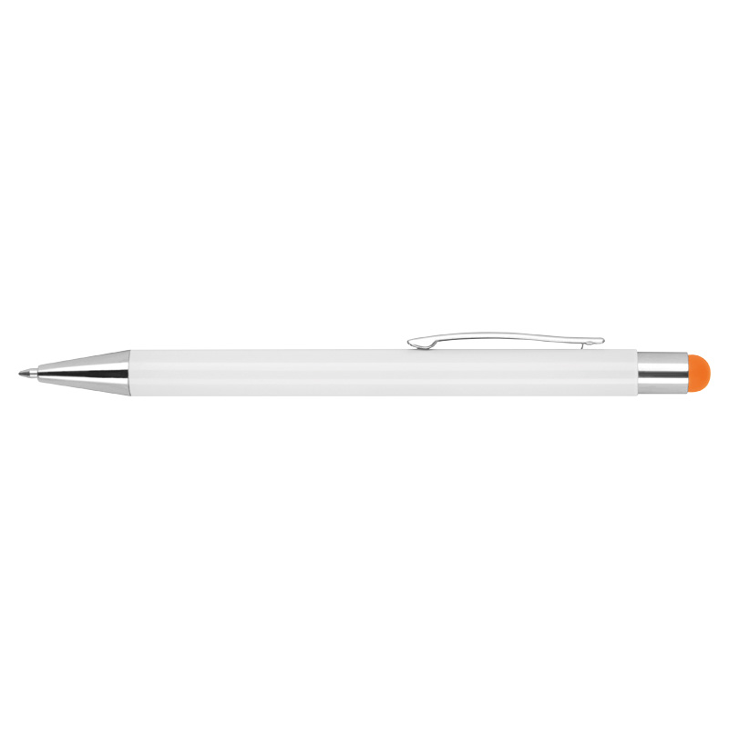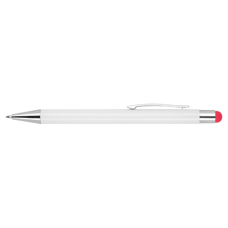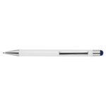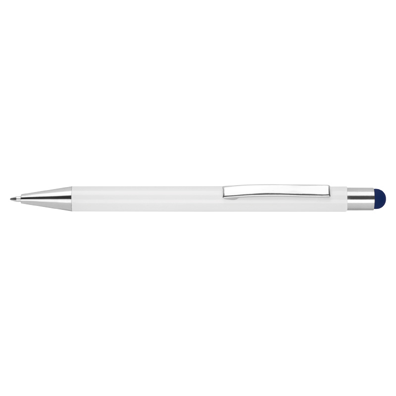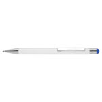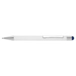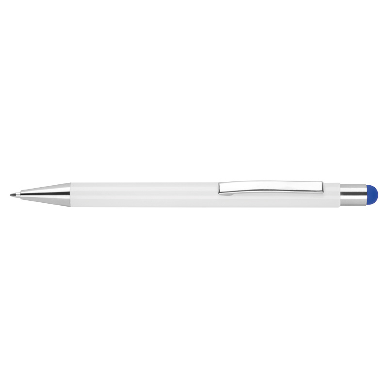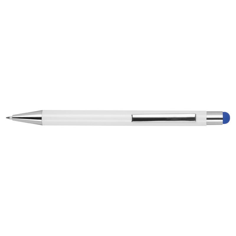 Алуминиева химикалка със сребърни апликации, сензорна функция и син надписващ пълнител. Вашето лого ще бъде отпечатано отдясно на клипа.