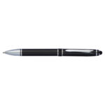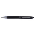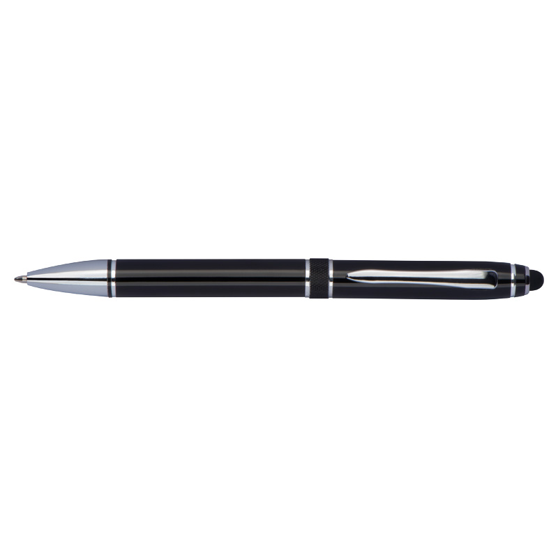 Висококачествена алуминиева въртяща се химикалка със син пълнител за писане, сребърни апликации и сензорна функция в екологичен калъф. Вашата реклама ще бъде гравирана от дясната страна вдясно на клипа.