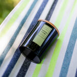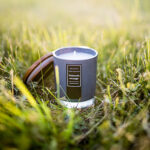 Ароматна свещ в стъклен съд, затворен с дървена капачка, с аромат на цитруси и портокалов цвят, която създава успокояваща атмосфера.
