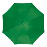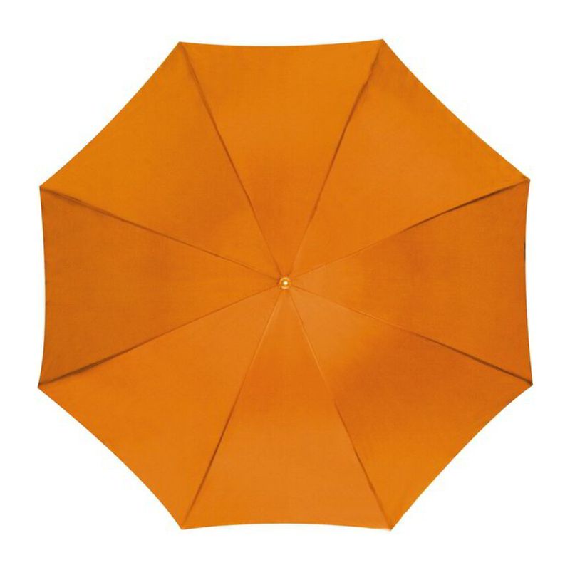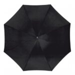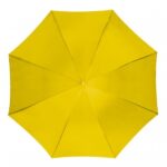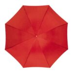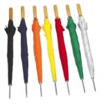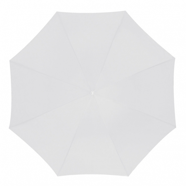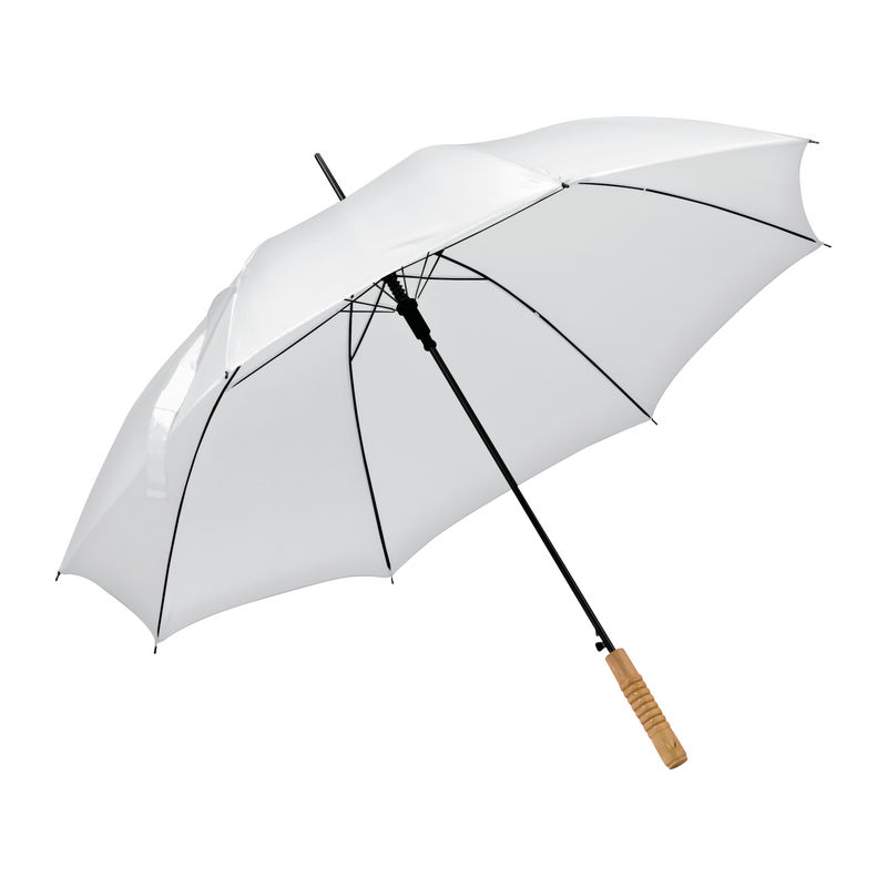 Автоматичен чадър с метални пръти, права дървена дръжка и цветни и бели панели от 170T полиестер.