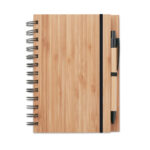 Тефтер с бамбукова корица и химикал. С двойна спирала. Съдържа 140 страници на редове от рециклирана хартия (70 листа). Подходяща химикалка с бамбуков корпус и ABS детайли. Бамбукът е естествен продукт, възможно е да има леки вариации в цвета и размера на артикул, което може да повлияе на крайния резултат от декорацията.