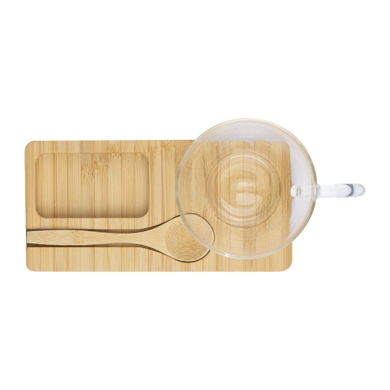 Стилен комплект за кафе, включващ бамбуков поднос с отделения за чаша, лъжица и захар, бамбукова лъжица и чаша от боросиликатно стъкло (150 мл).