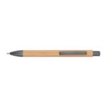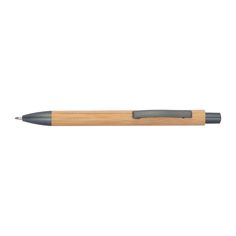 Бамбукова химикалка с механизъм за натискане. Включва голям пълнител със син надпис и апликации в атрацит.