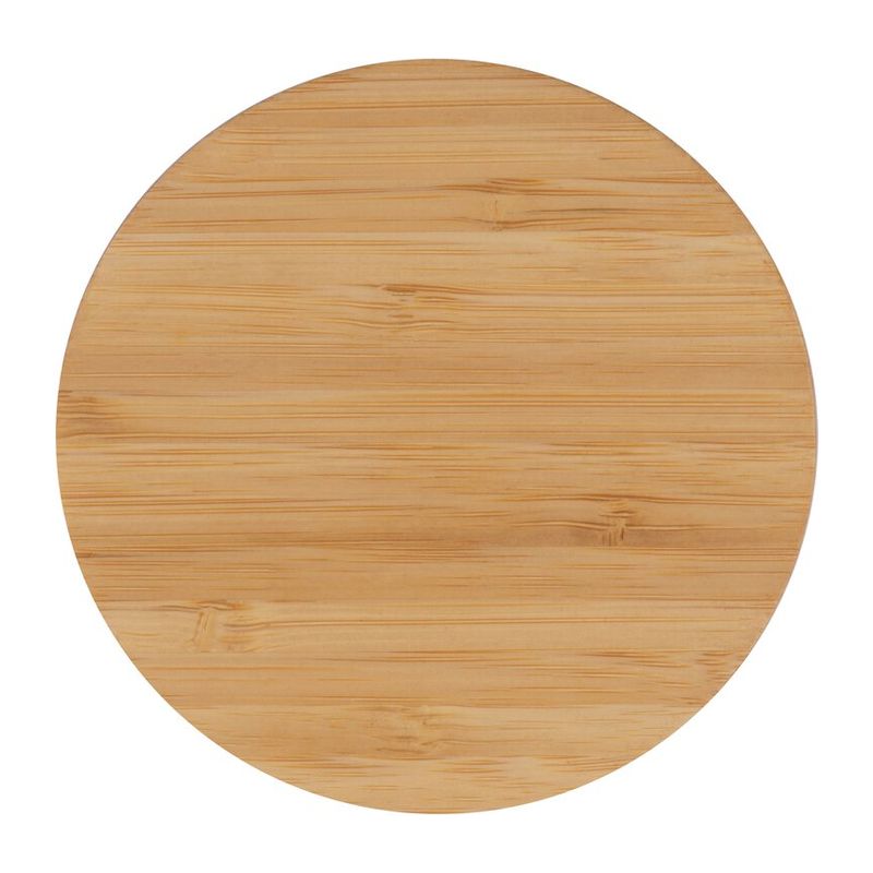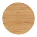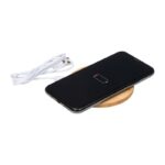 Кръгло безжично зарядно от бамбук с кабел за зареждане, подходящо за всички смартфони с активиран QI.