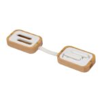 Ергономични Bluetooth 5.0 слушалки за поставяне в ушите с индикатор за зареждане в USB станция за зареждане, която служи и като опаковка. Радиообхват до 10 метра, време за зареждане прибл. 1 час, време на работа 2-3 часа и 300 mAh батерия. Благодарение на естествения бамбук гра