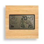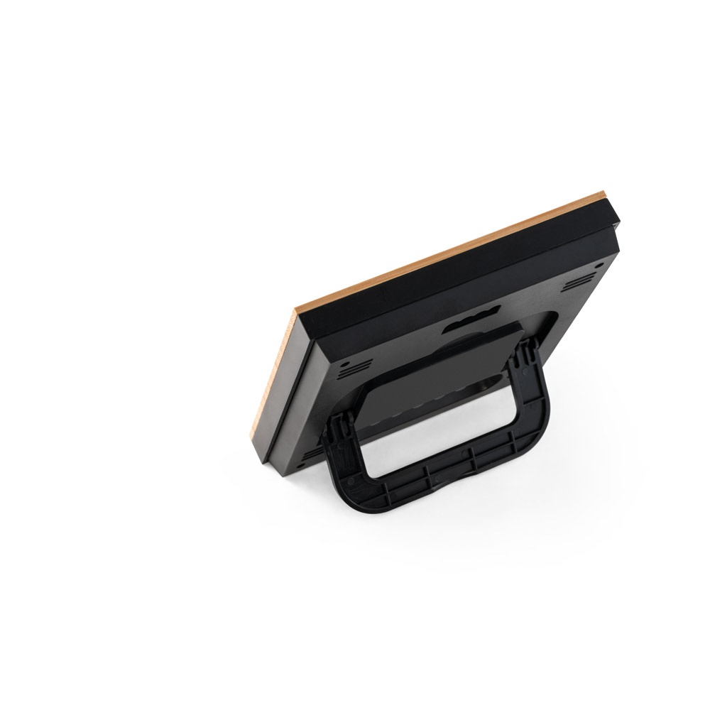 Настолен часовник от ABS и бамбук със следните функции: часовник, аларма, монитор за влажност и термометър. Включва две AAA батерии. Доставя се в подаръчна кутия от крафт хартия. 130 x 130 x 21 мм