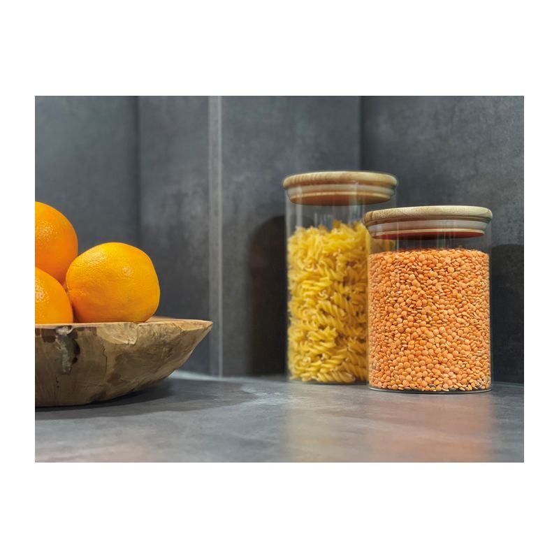 Буркан за съхранение от боросиликатно стъкло с бамбуков капак и силиконов пръстен.
