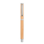 Бамбукова ролкова химикалка с фитинги от неръждаема стомана. Синьо гел мастило. Бамбукът е естествен продукт, възможно е да има леки вариации в цвета и размера на артикул, което може да повлияе на крайния резултат от декорацията.