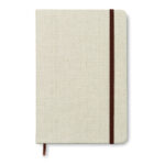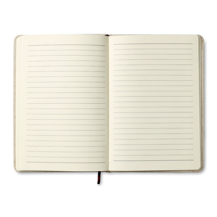 Тефтер А5 с твърда брезентова корица. Съдържа 192 страници на редове (96 листа). Контрастен вертикален ластик за затваряне и текстилна лента за отметки.