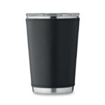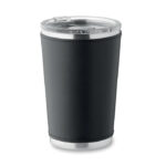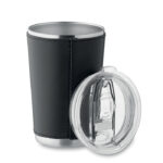 Чаша с двойна стена от рециклирана неръждаема стомана (90% рециклирана неръждаема стомана и 10% неръждаема стомана) с подвижна втулка от PU кожа. Капак с плъзгащ се отвор за глътка. Без течове. Вместимост: 350 мл.