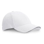 Шапка от 100% памук, тип „сандвич“ с 6 панела и 6 бродирани вентилационни дипки (260 g/m²). Регулируема с метална катарама. Размер: 580 мм
