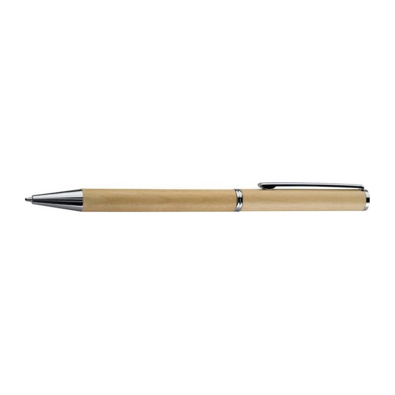 Класическа дървена ЕКО химикалка със син надписващ пластмасов пълнител, в картонена кутия.