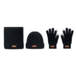 Зимен комплект от 3 части. Включва RPET шапка, шал и тактилни ръкавици с етикет за зоната за печат.