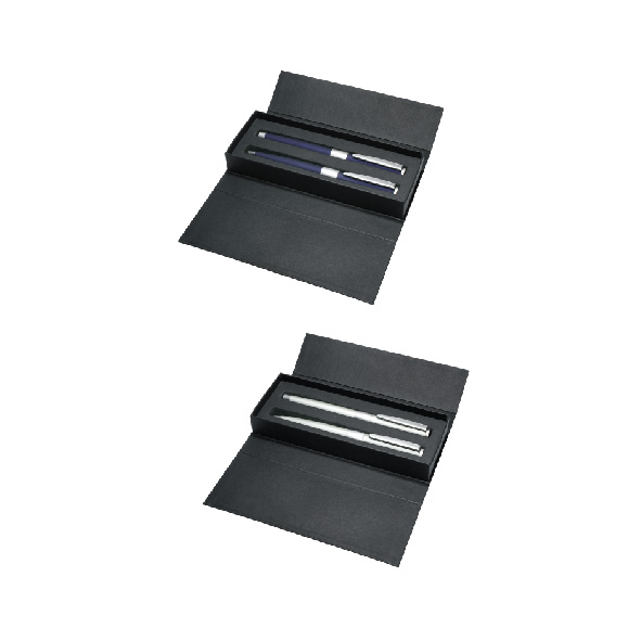 Комплект химикалки в подаръчна кутия. Месингова усукваща се химикалка и ролкова топка. Синьо / черно мастило.