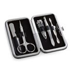 Комплект за маникюр от пет части с пила за нокти, ножица, нокторезачка, пинсета и щипка за кожички. Доставя се в полиуретанов калъф. 110 x 65 x 20 мм