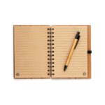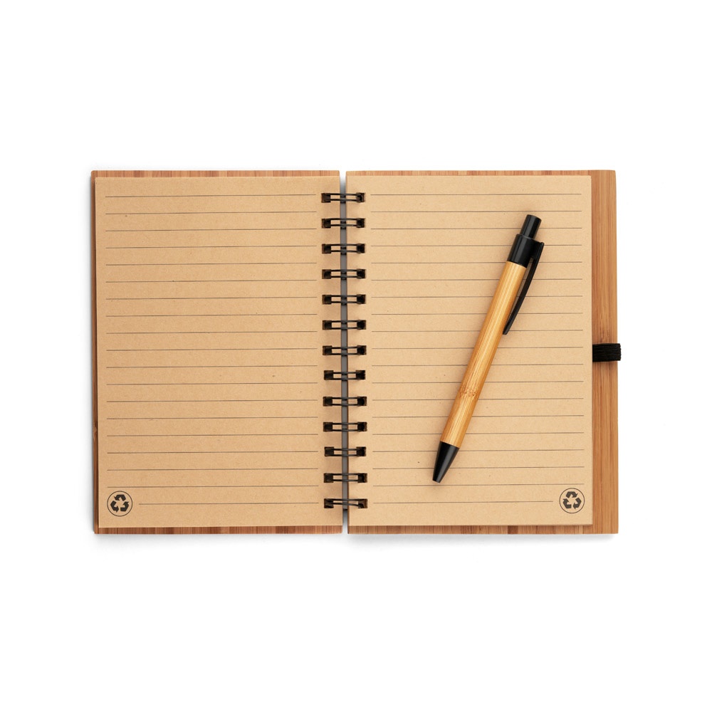 Спирален тефтер B6 с твърда корица от бамбук, 140 рециклирани страници с редове и държач за химикалка (химикалката е включена) 135 х 180 мм