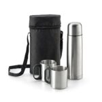 Комплект термос и 2 чаши изработени от неръждаема стомана. Включва 2 чаши с вместимост до 200 мл. и термос с двойна стена и вместимост до 500 мл. Поставени в чанта от полиестер 600D с регулираща се дръжка. Торбичка: 155 x 250 x 90 мм