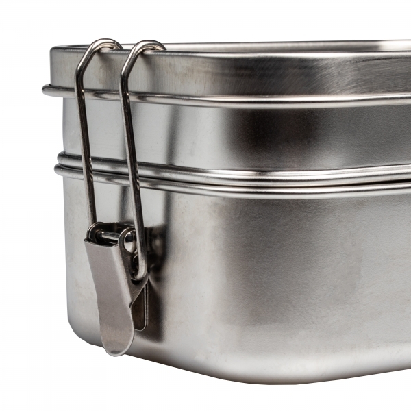 Двойна кутия за обяд, изработена от неръждаема стомана. Тя разполага с капак, който се затваря със скоба от двете страни за сигурно и удобно съхранение. Кутията има вместимост от 700 мл за долното отделение и 450 мл за горното.