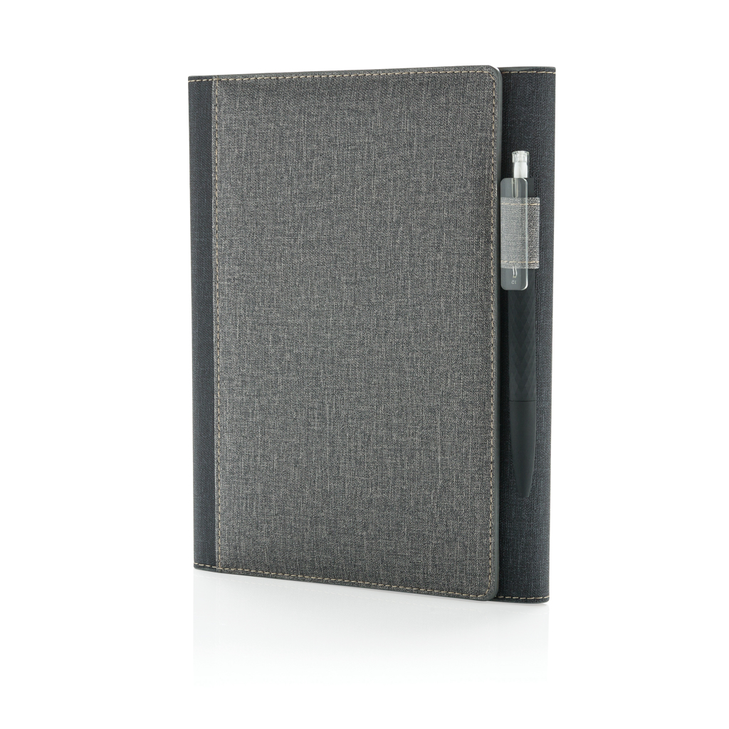 300D rPET A4 папка с еластично затваряне. 210D rPET подплата с множество джобове, държач за писалка (писалката не е включена) и тетрадка с 20 бели подплатени листи от устойчиво управление на горите. Доставя се в нетъкан плик. 230 x 330 x 50 мм