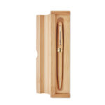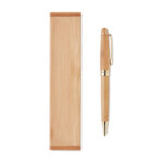 Подаръчен комплект с въртяща се химикалка в бамбукова кутия. Синьо мастило. Бамбукът е естествен продукт, възможно е да има леки вариации в цвета и размера на артикул, което може да повлияе на крайния резултат от декорацията.