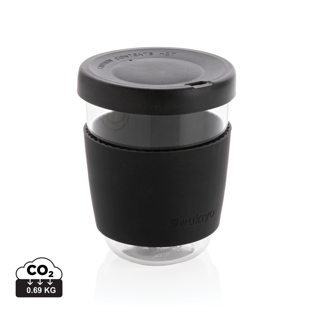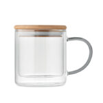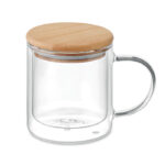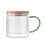 Двустенна чаша от боросиликатно стъкло с бамбуков капак и цветни дръжки. Вместимост: 300 мл.