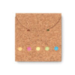 Подложка за лепящи листчета с коркова обвивка за плик. 125 листа големи жълти блокове за лепящи листчета и 25 листа с 5 различни цвята маркери за страници. Коркът е 100% естествен материал. Поради структурното естество и порьозността на повърхността, крайният печатен резултат за артикул може да има отклонения.