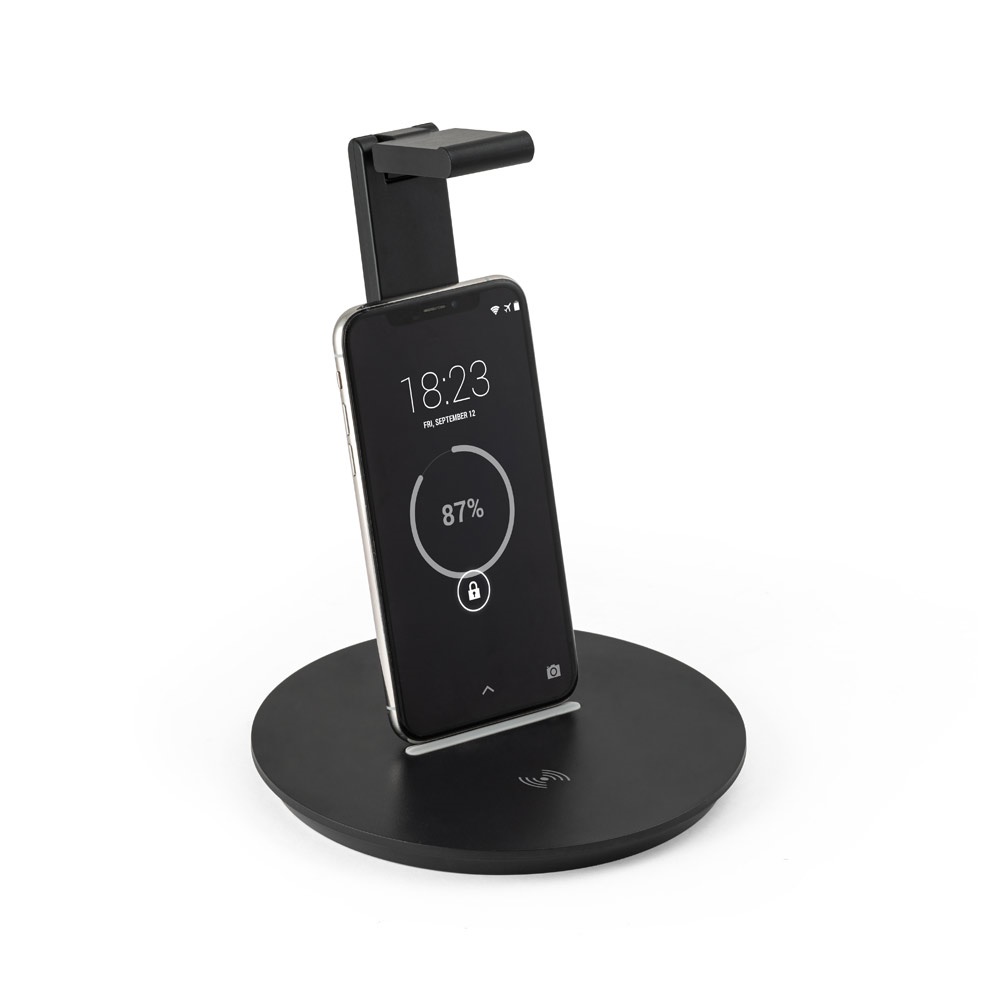 Стойка за слушалки от ABS с вградено безжично зарядно устройство. 10W мощност, 1 м USB към USB-C кабел. USB-C вход с 5V/2A или 9V/1’1A и безжичен изход с 5V/1A или 9V/1’1A. Доставя се в черна подаръчна кутия. ø160 x 257 мм | Кутия: 175 x 47 x 344 мм