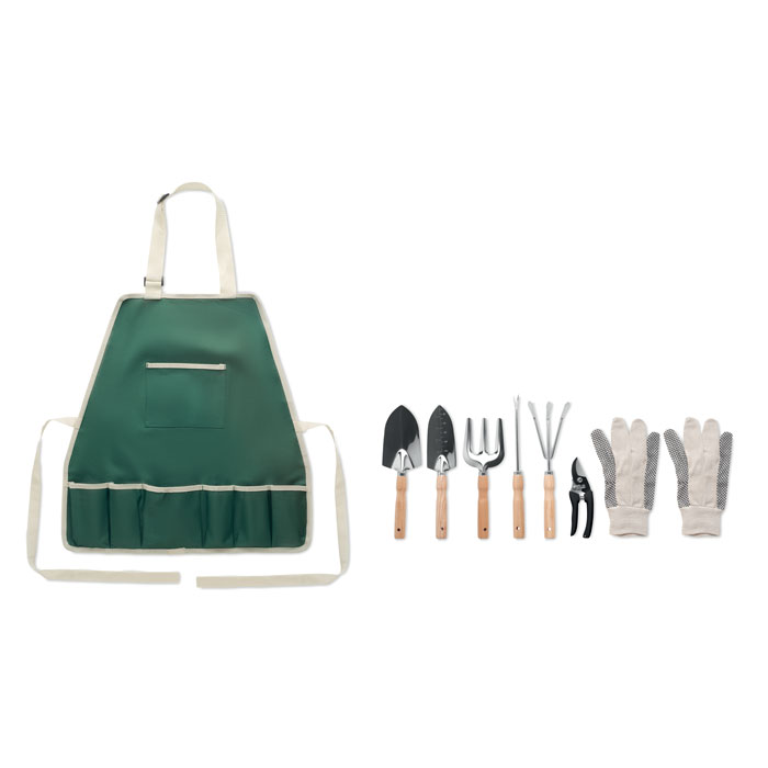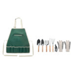 Комплект от 7 градински инструмента в престилка. 1 чифт градински ръкавици, 2 вилици, 1 ножица, 1 плевка и 2 мистрии.