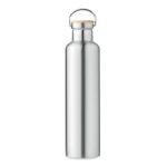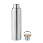 Изолираща вакуумна колба от неръждаема стомана с двойна стена с бамбуков капак и дръжка за носене. Вместимост: 1L. Бамбукът е естествен продукт, възможно е да има леки вариации в цвета и размера на артикул, което може да повлияе на крайния резултат от декорацията.