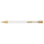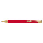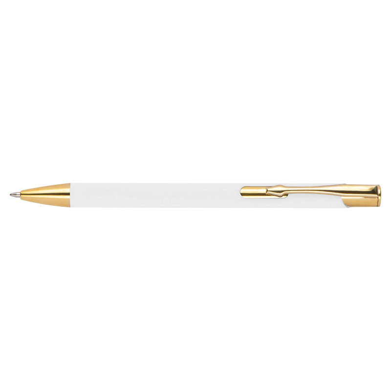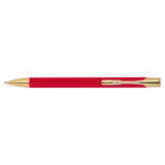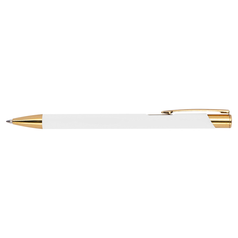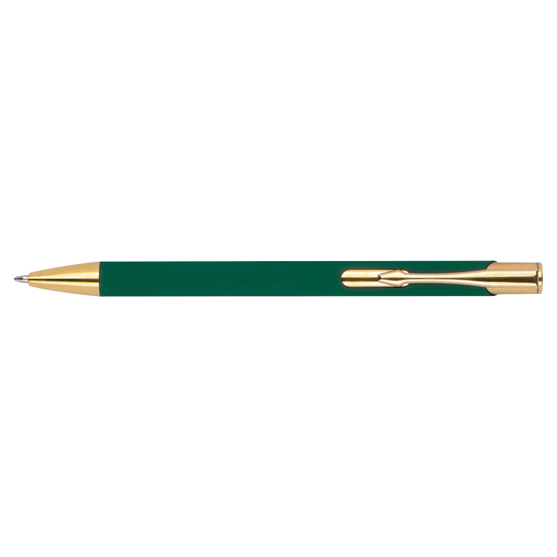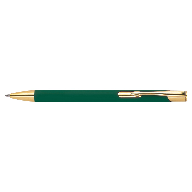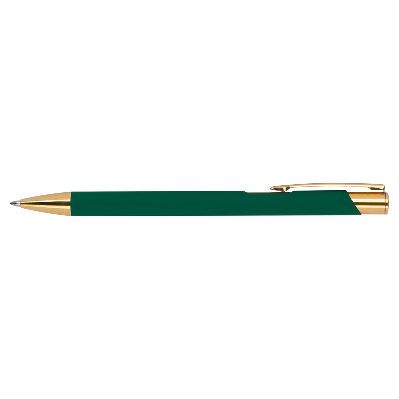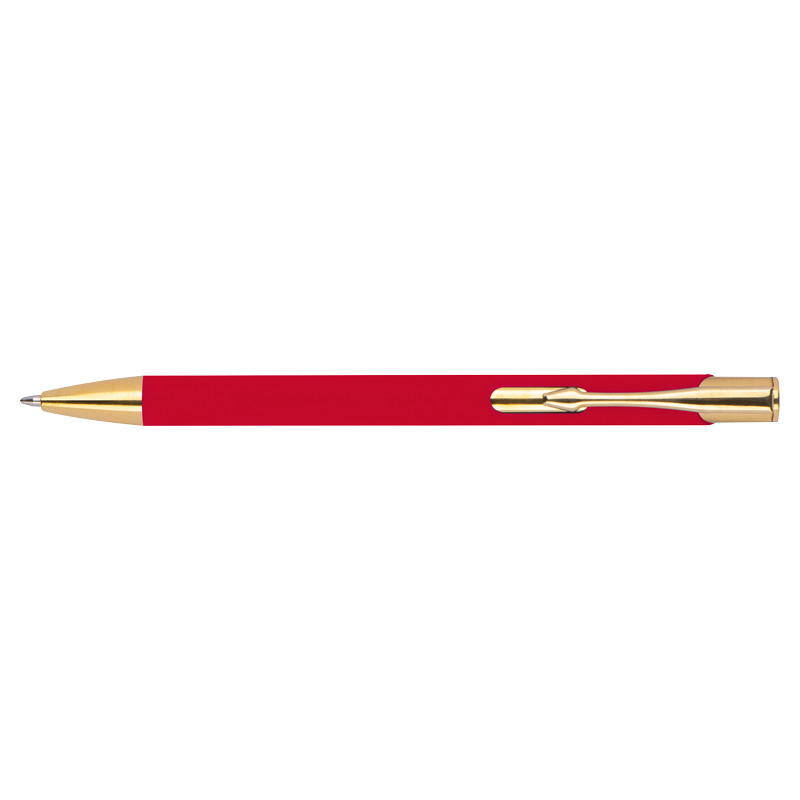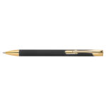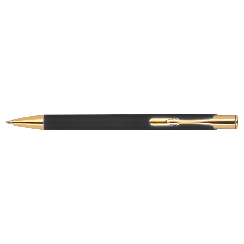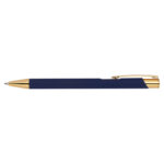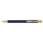 Химикалка, изработена от алуминий със златни фитинги, гумено покритие и пълнител с голяма вместимост със син надпис.