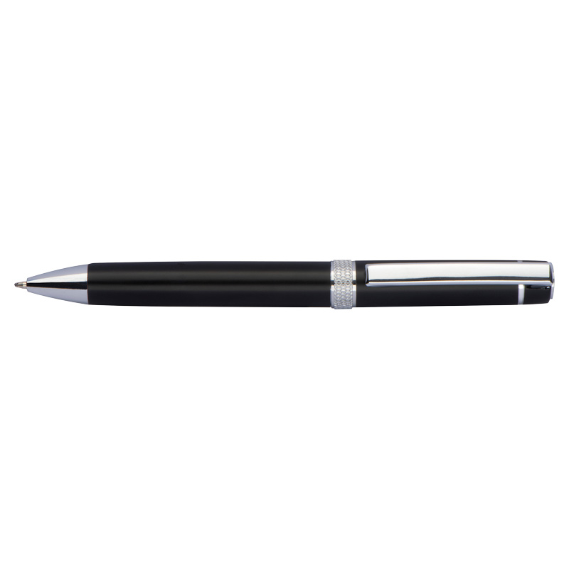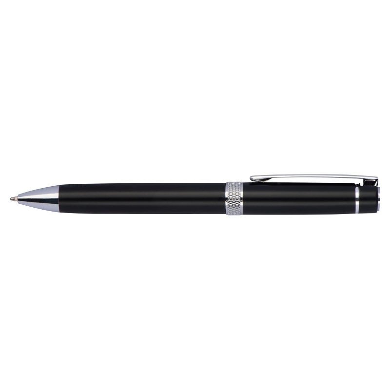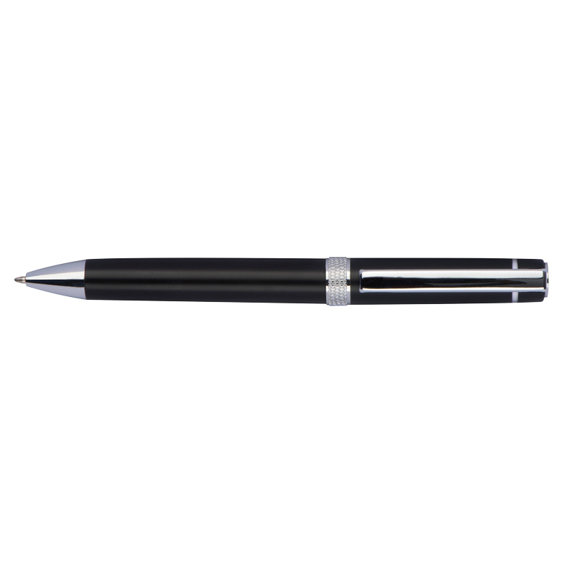 Метална химикалка Twist с оребрен декоративен пръстен и син пълнител за писане.