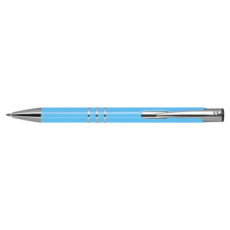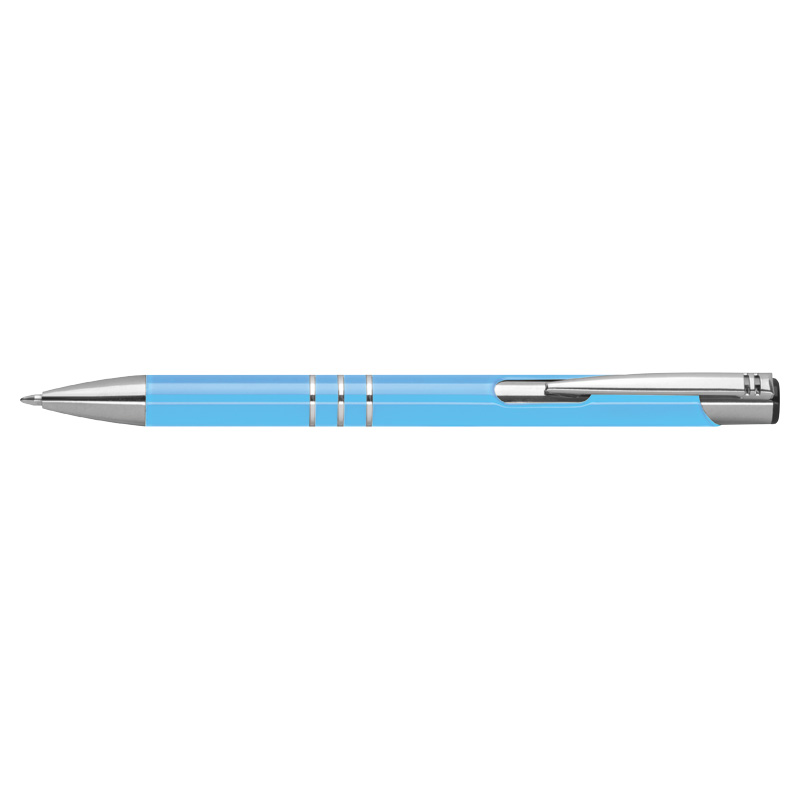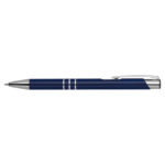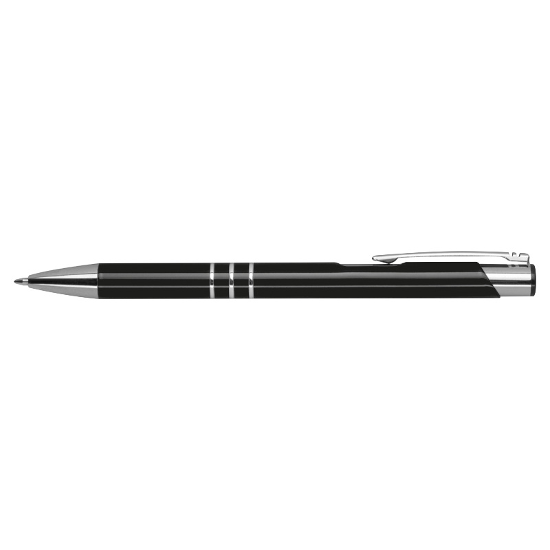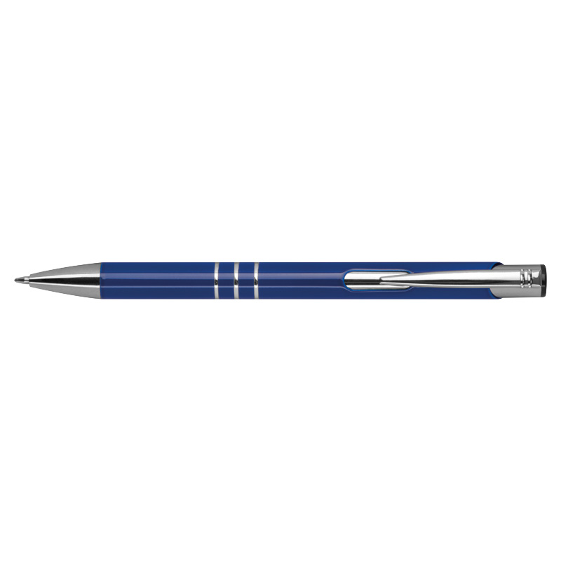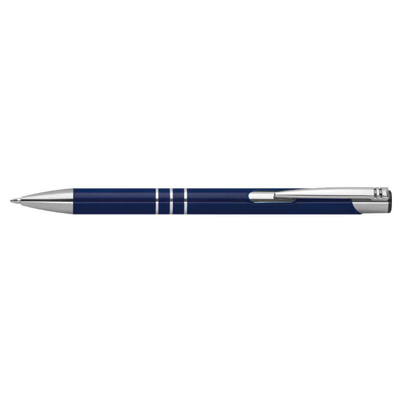 Изцяло лакирана метална химикалка с 3 декоративни ринга и син надписващ пълнител с голяма вместимост.