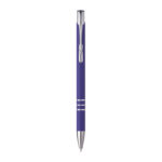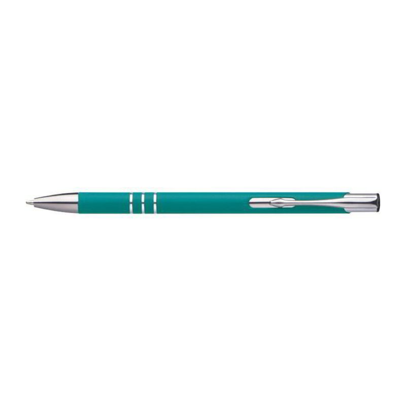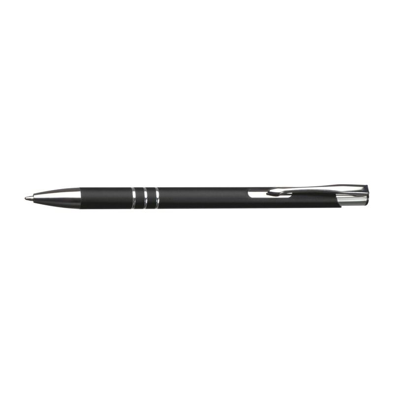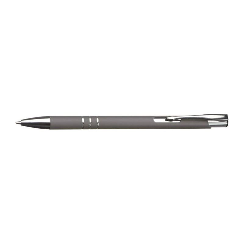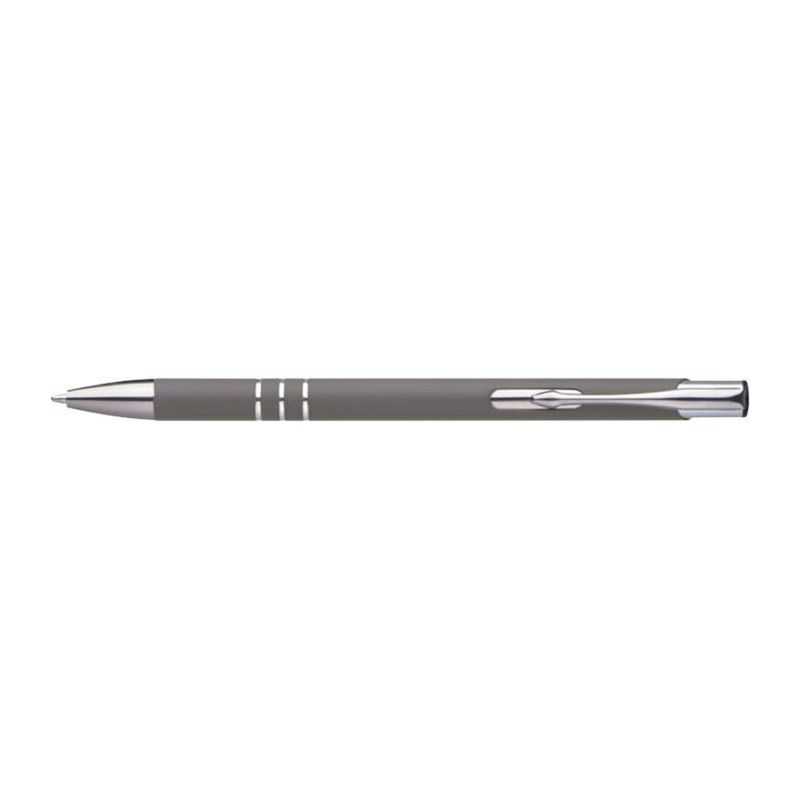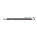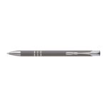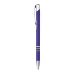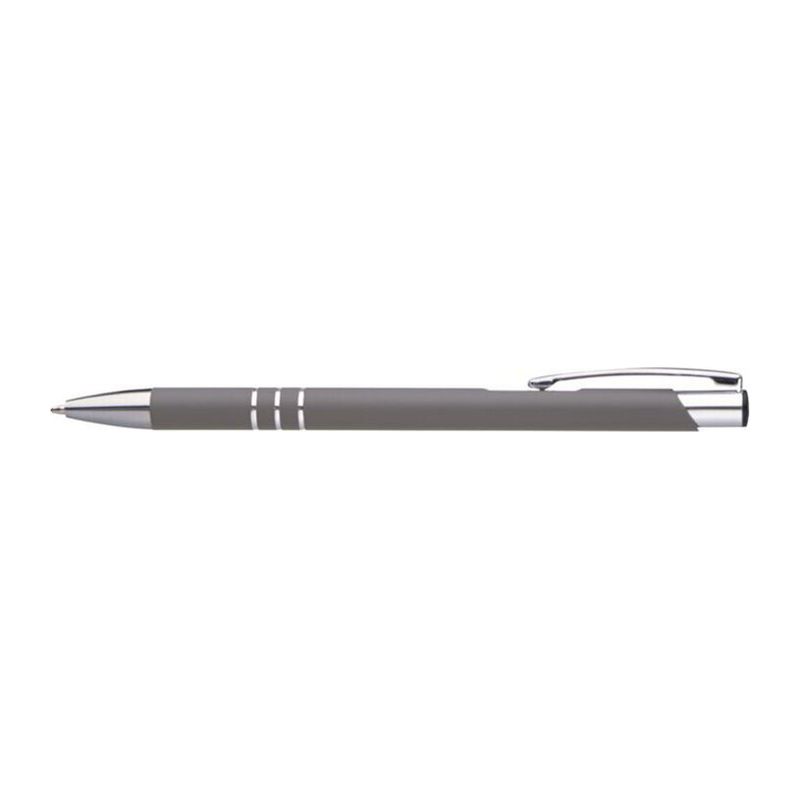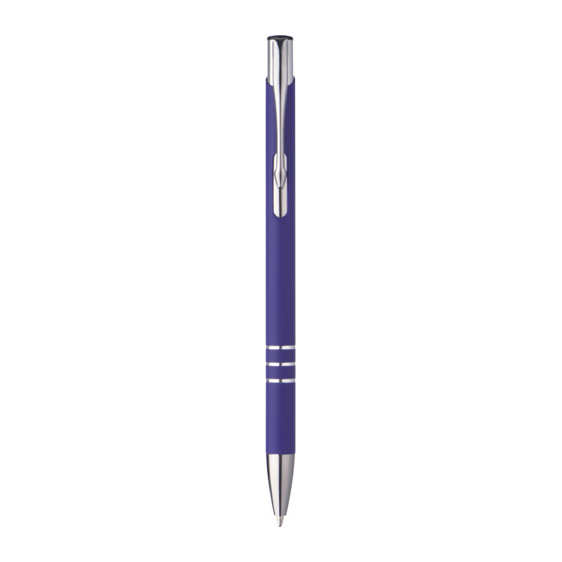 Тънка гумирана метална химикалка с пластмасов пълнител със син надпис.