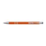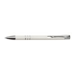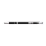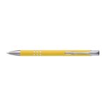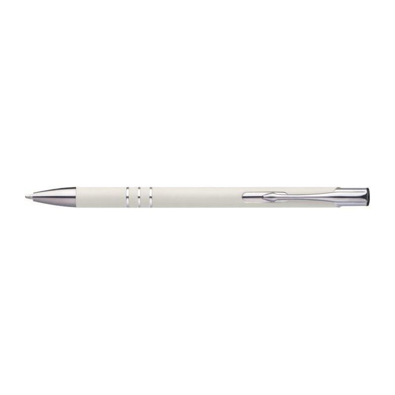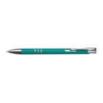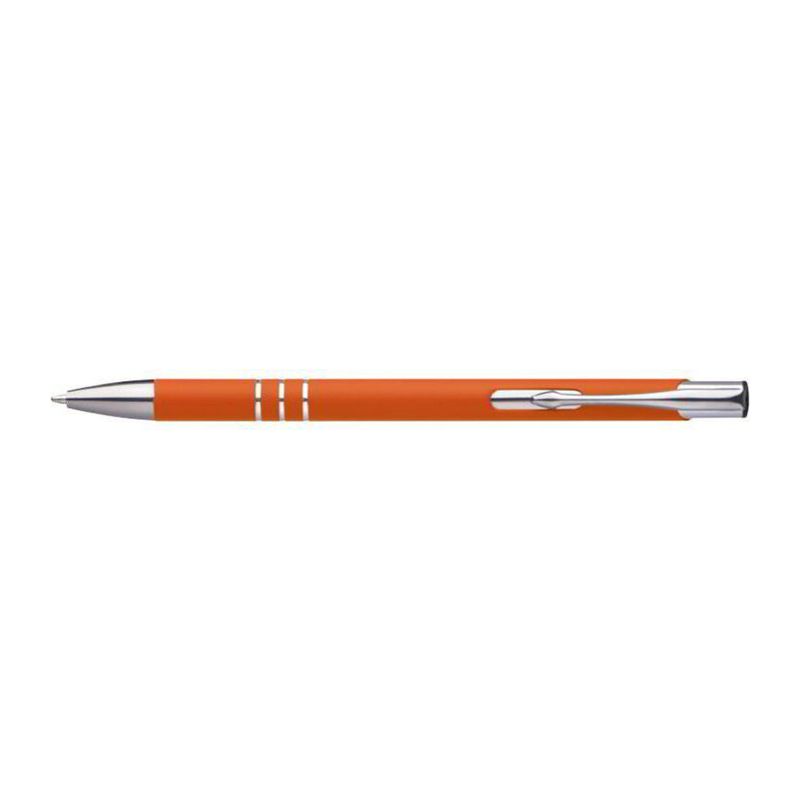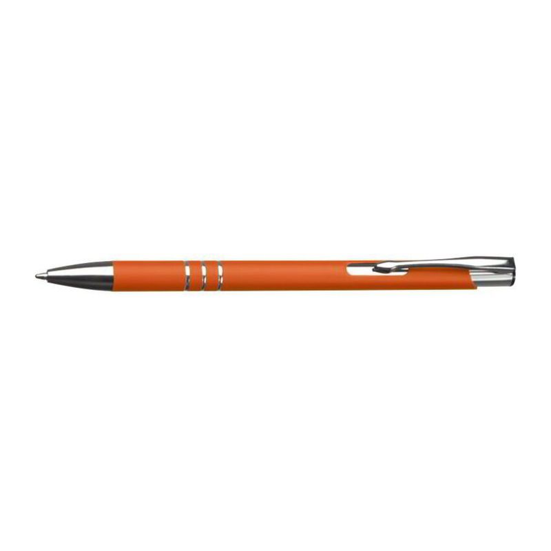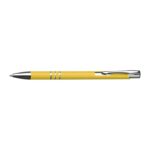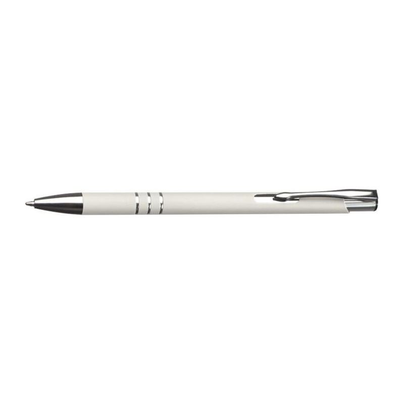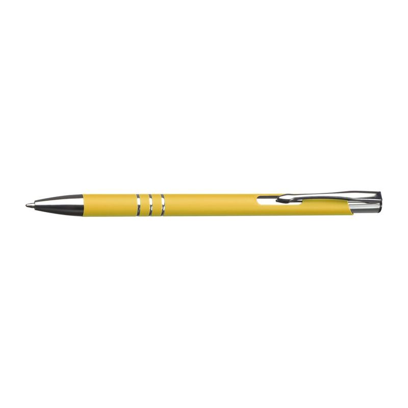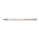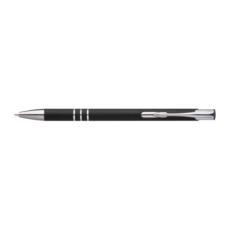 Тънка гумирана метална химикалка с пластмасов пълнител със син надпис.