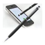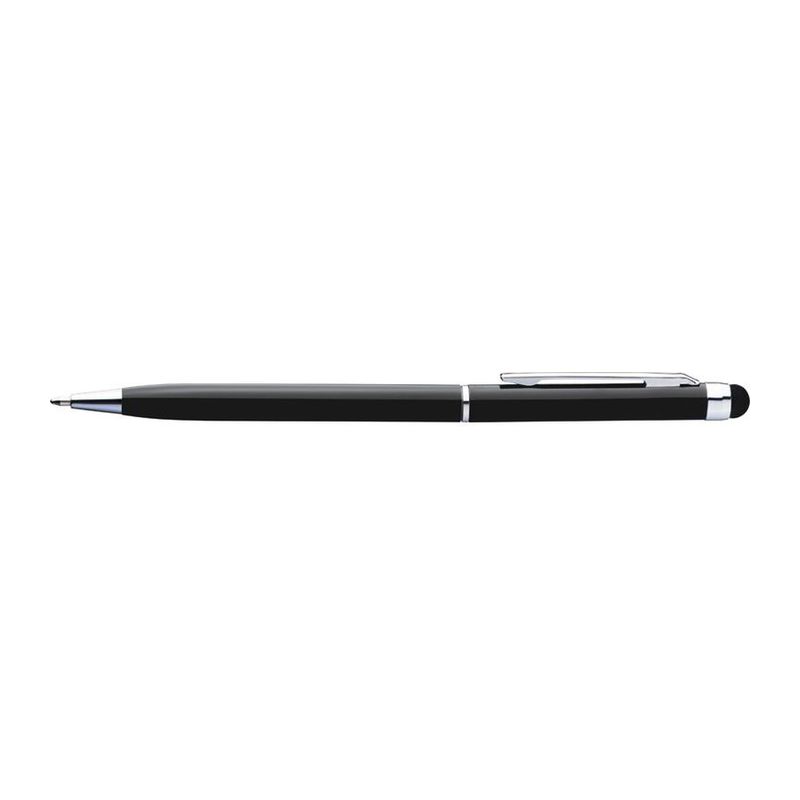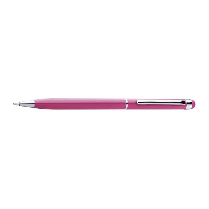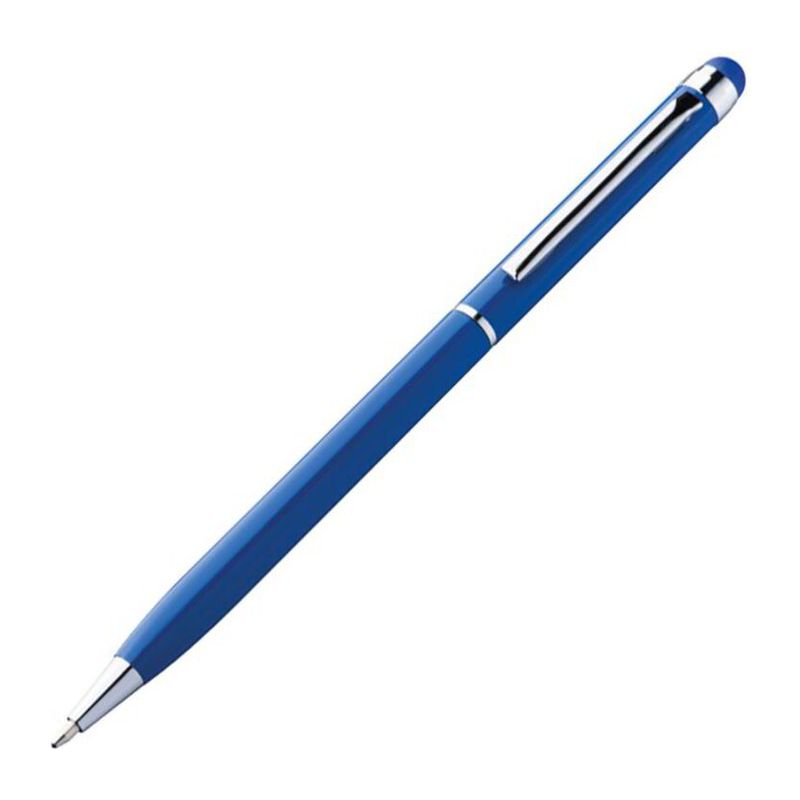 Алуминиева химикалка с пластмасов пълнител със син надпис и сензорна функция в съответствие с цвета над щипката.