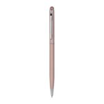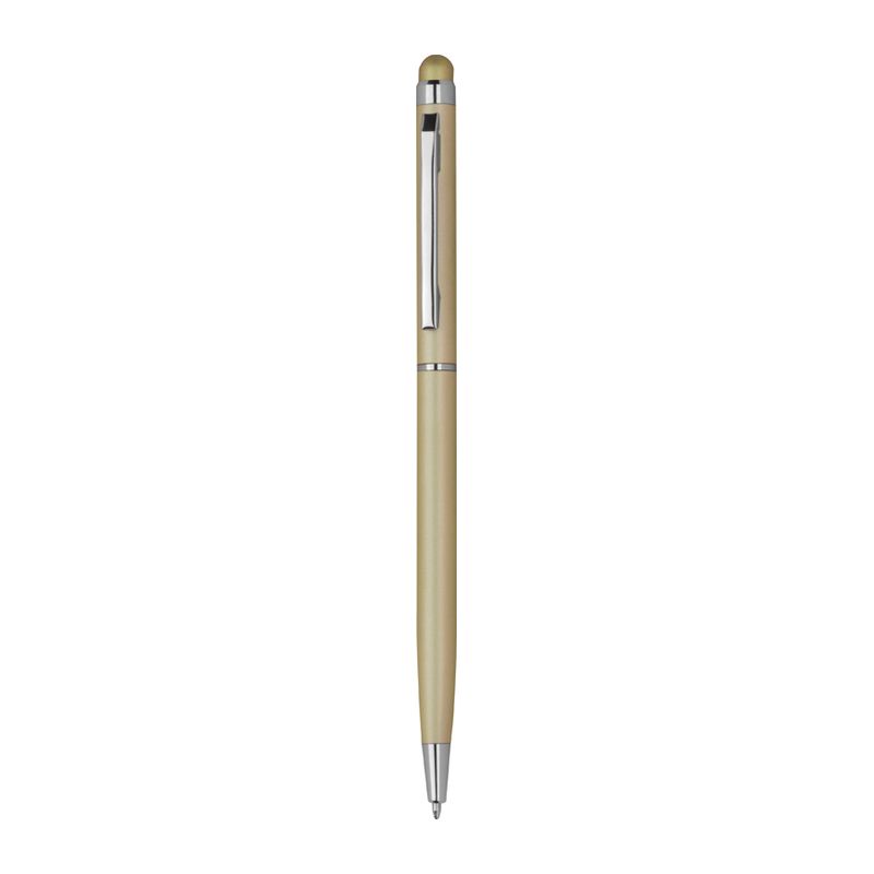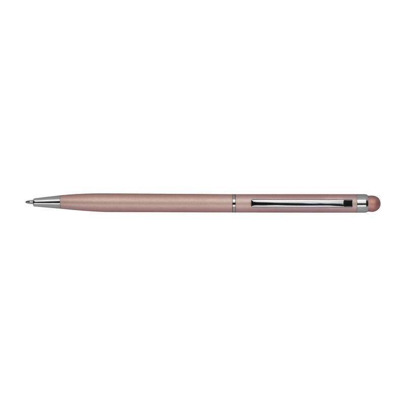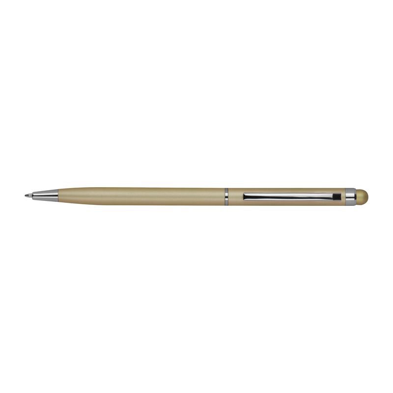 Метална химикалка с пластмасов пълнител със синьо надписване и сензорна функция в съответствие с цвета над клипса.