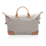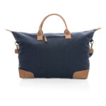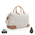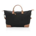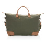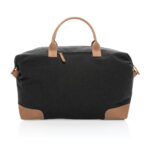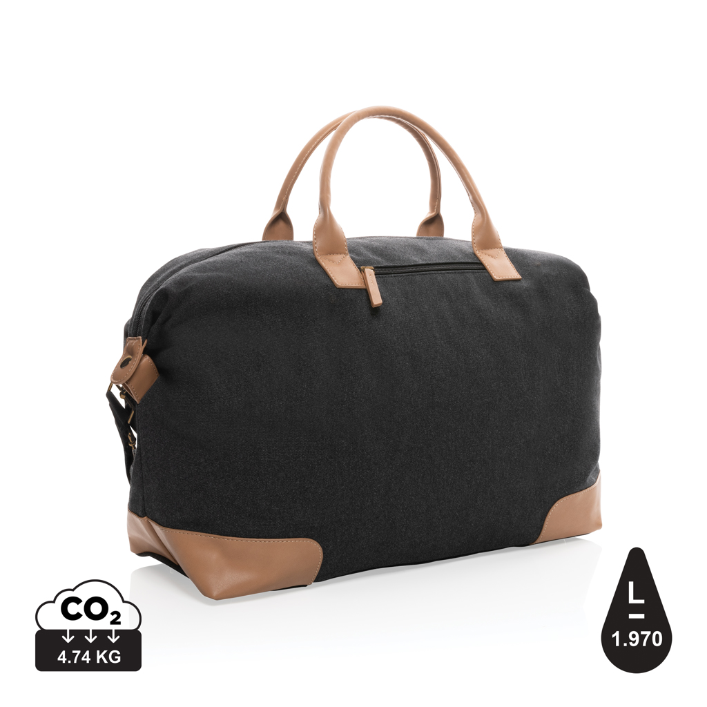 Планирайте своето перфектно бягство с този голям 16oz. рециклирана платнена уикенд чанта. Чантата разполага с едно голямо просторно отделение с преден джоб и PU дръжки. Дъното разполага с четири месингови шипа, за да поддържа чантата ви чиста, когато я поставите на пода. Всяка уикенд чанта спестява 1970 литра вода. 2% от приходите от всеки продаден продукт на Impact ще бъдат дарени на Water.org. Състав 60% рециклиран памук и 40% рециклиран полиестер. Подплата от 150D рециклиран полиестер.
