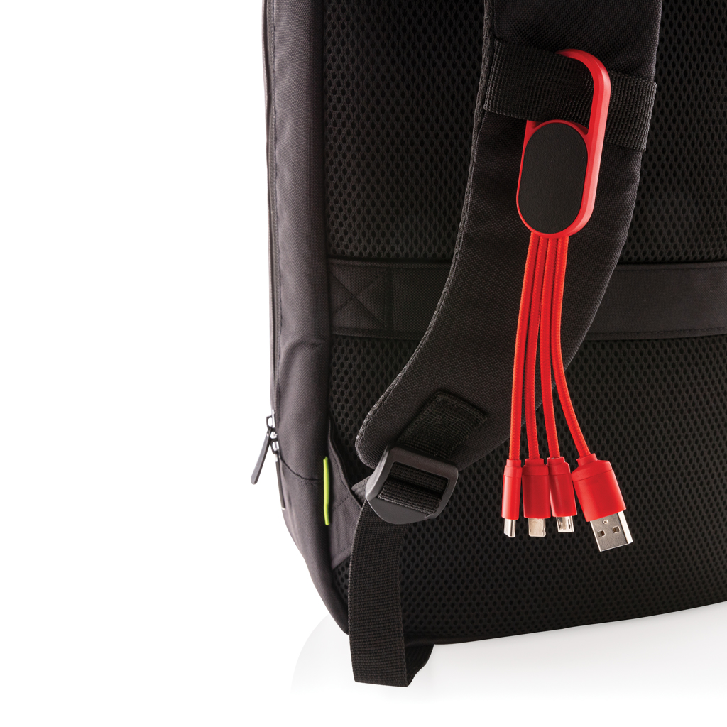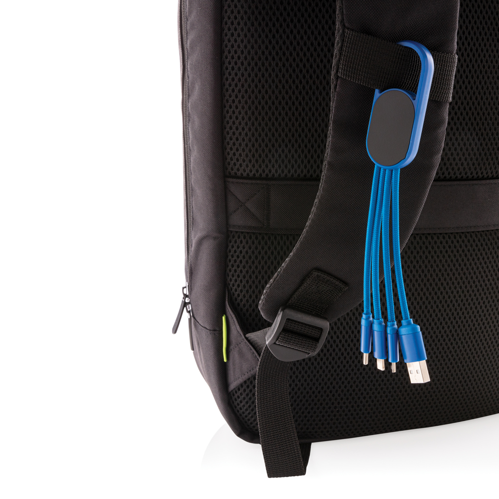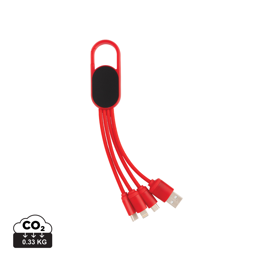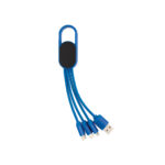 Кабел за зареждане 4 в 1 с карабинер. USB входен щепсел и за изход: двустранен конектор за IOS устройства, micro USB и тип C изход. Подходящ за зареждане на всички обикновени мобилни устройства. Корпус от ABS материал с 10 cm дълги найлонови плетени кабели. Поддържа зареждане до 2.1A.