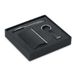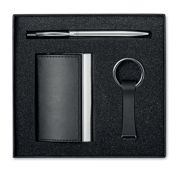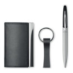 Бизнес подаръчен комплект, включващ метална завъртяща се химикалка, цинкова сплав с PU ключодържател и държач за карти. Предлага се в кутия. Черно мастило.