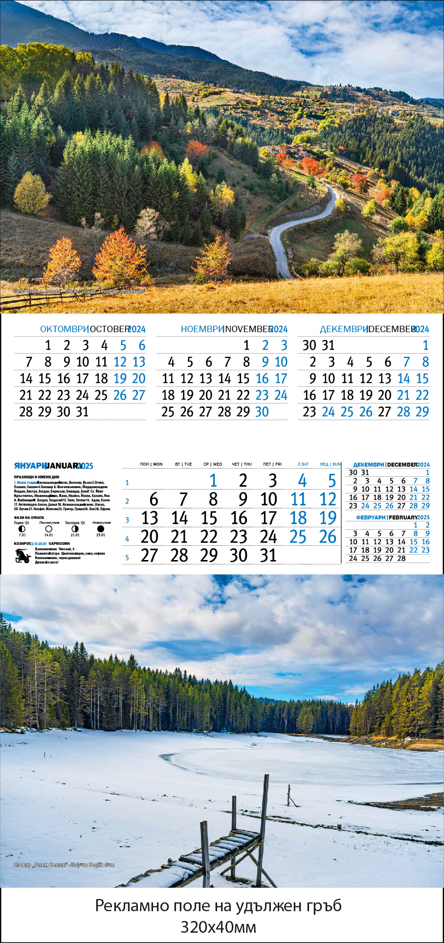 Календариумът съдържа: имени дни, фази на луната, зодия, малък календар на предишен и следващ месец, всички месеци от октомври 2023 до януари 2025 включително. Календарът може да се закача по два начина: сгънат като един месец или разтворен с 2 месеца един под друг.