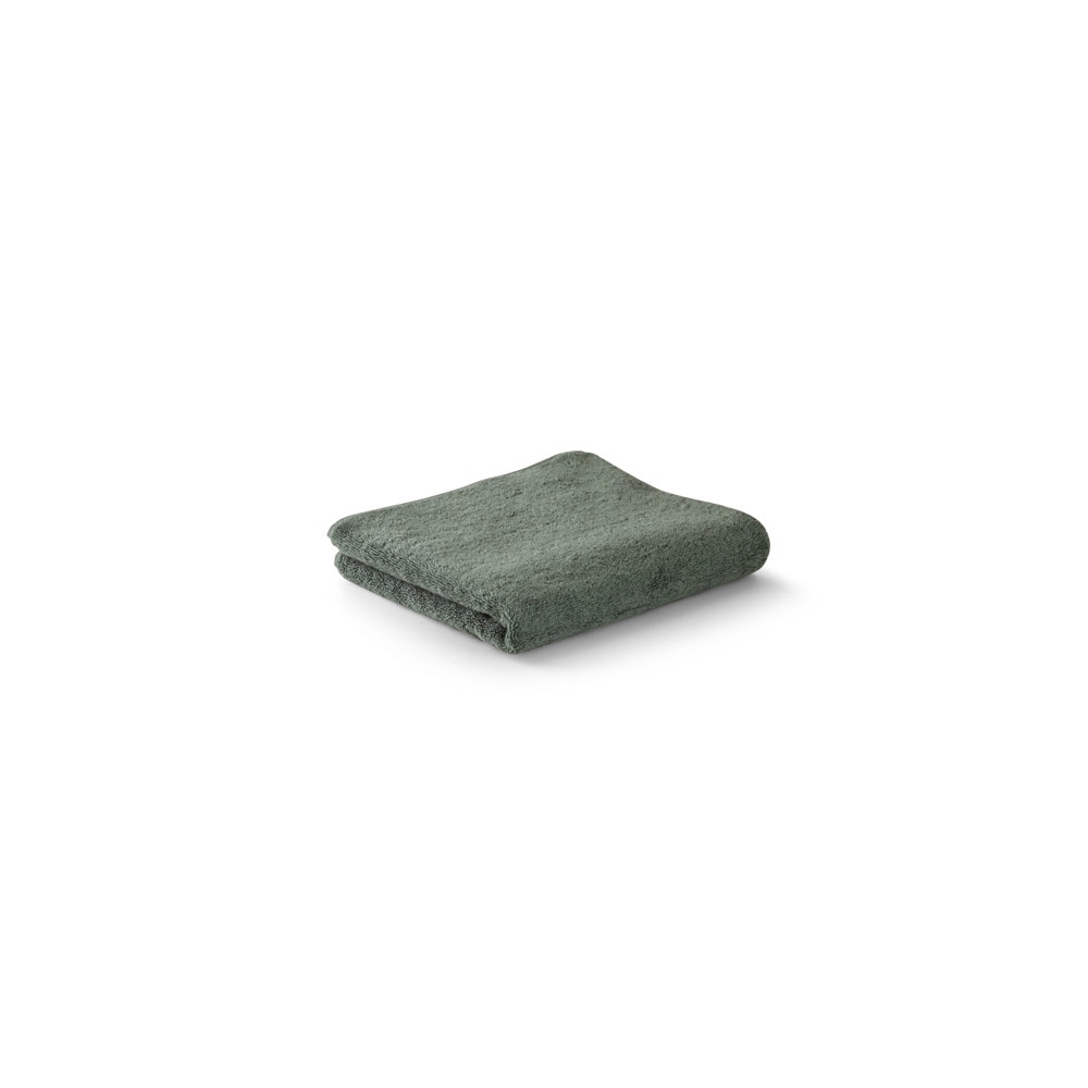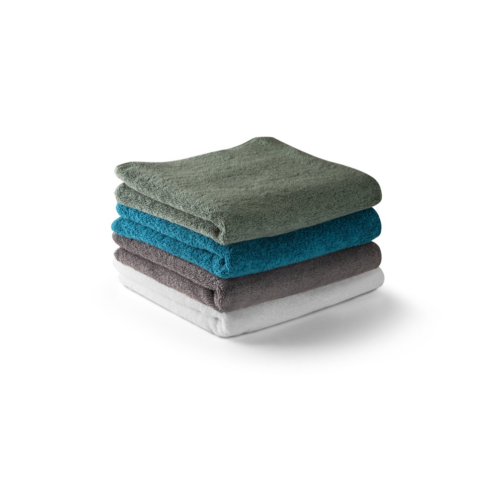 Кърпа за лице с плътност 350 g/m², изработена от 82% памук и 18% рециклиран памук, осигуряваща мекота и устойчивост.