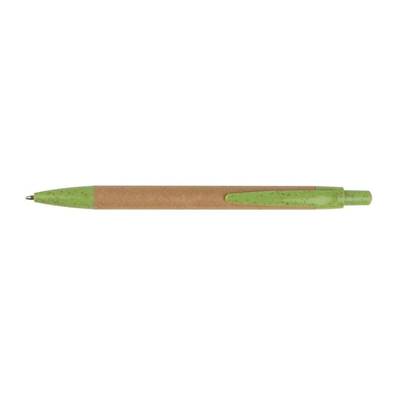 Химикалка, изработен от рециклиран картон, със син пълнител за писане. Всички апликации са направени от устойчива житна слама.
