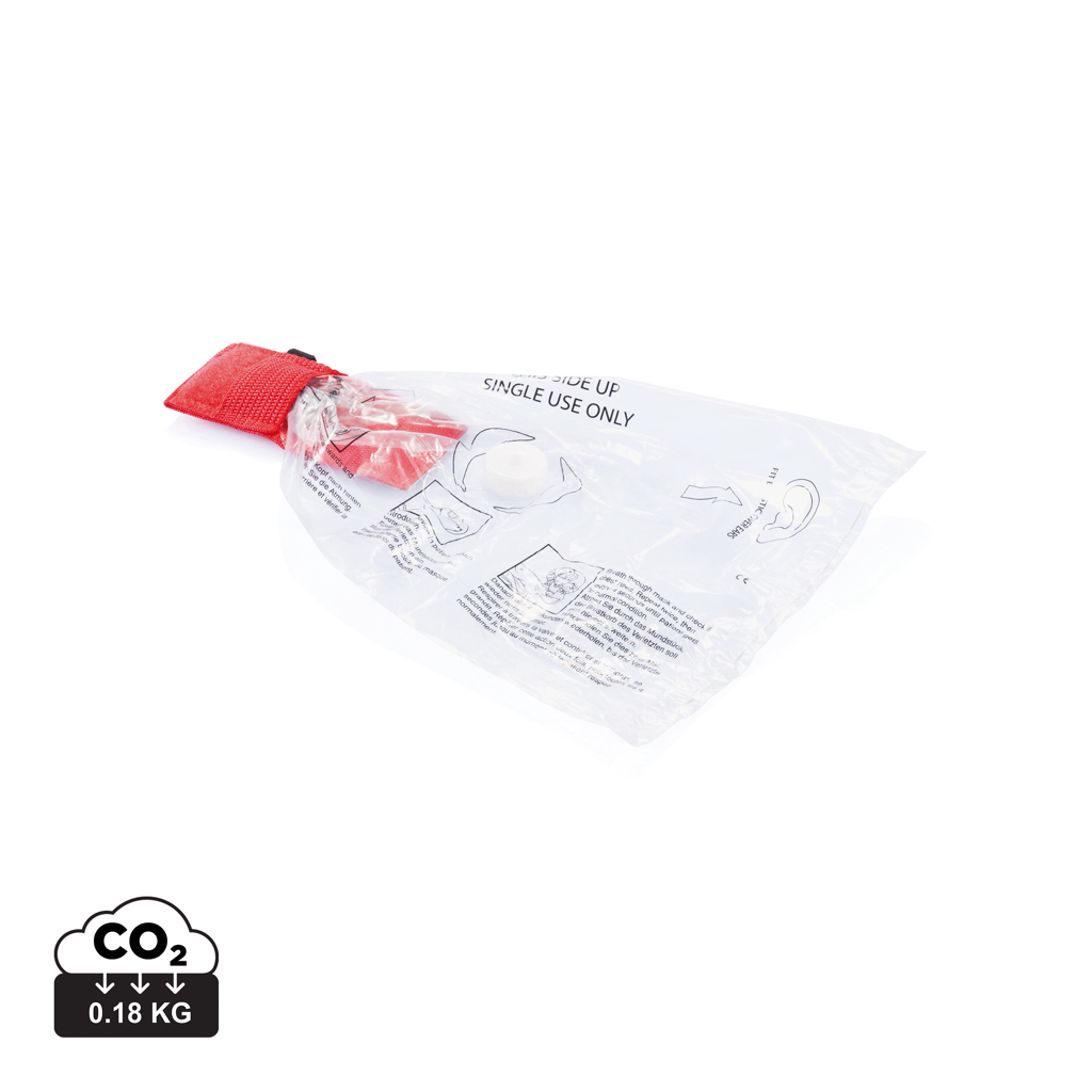 Малък предпазен щит за CPR лице за реанимация уста в уста в торбичка в стил ремъци с велкро затваряне и стоманен ключодържател. Съответства на EN 13485:2003.